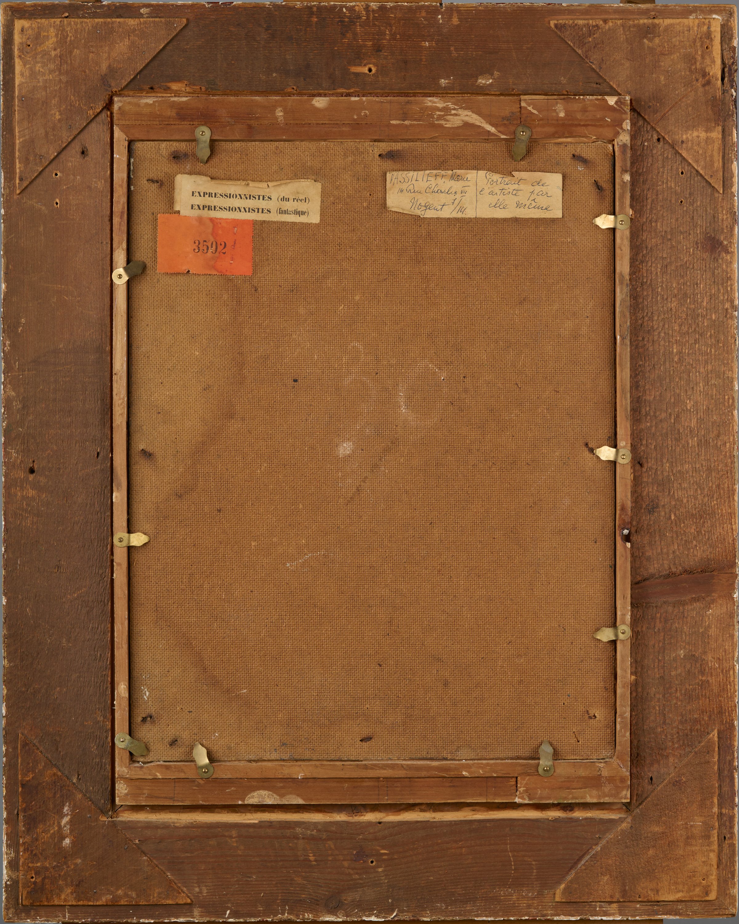 Etiquette avec l'inscription "Marie Vassilieff, 14 rue Charles VIII, Nogent sur Marne, portrait de l'artiste par elle-même".