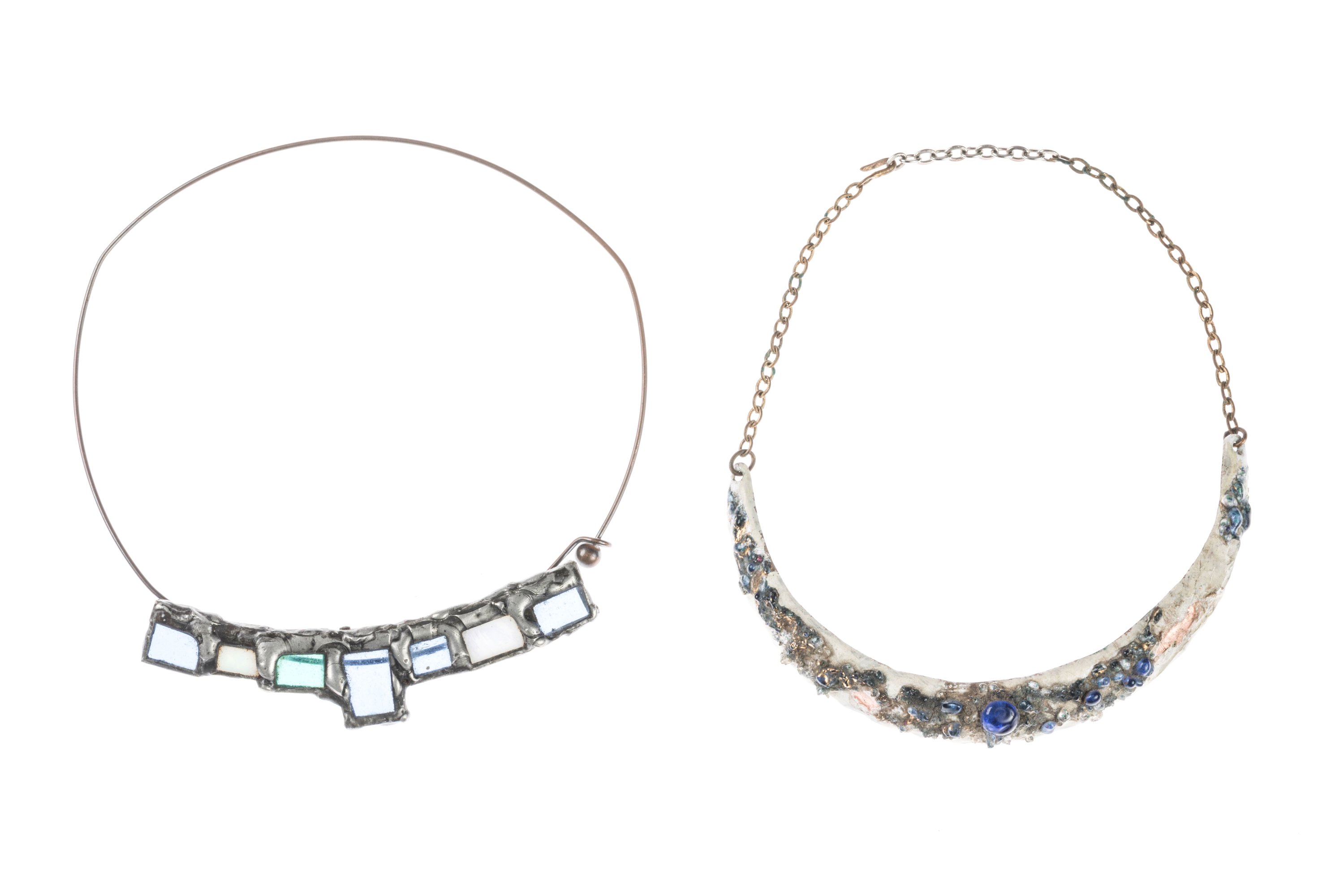 L'un en métal soudé et verre, l'autre en émail avec incrustation.