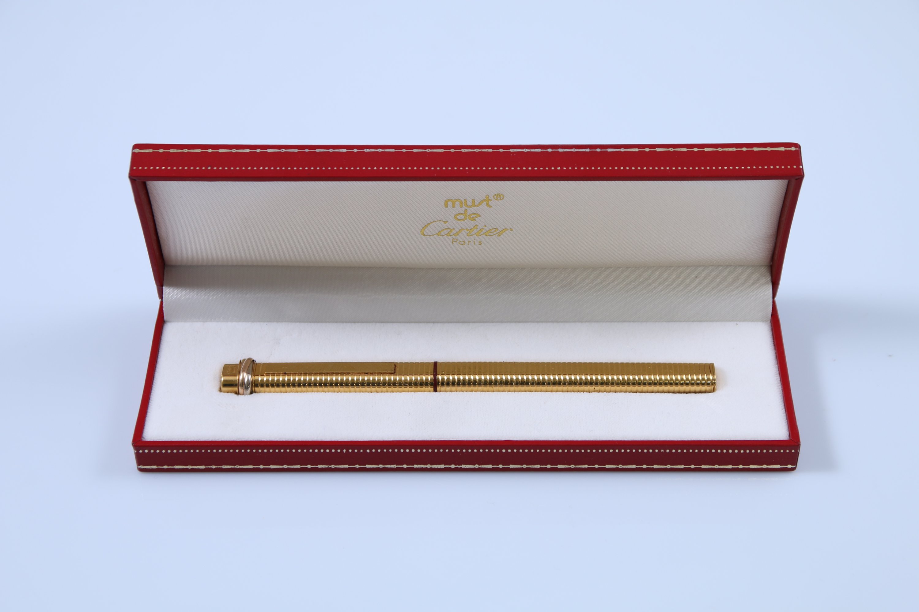 A plume en résine bordeaux, roller en résine noire et trintiy en métal doré.