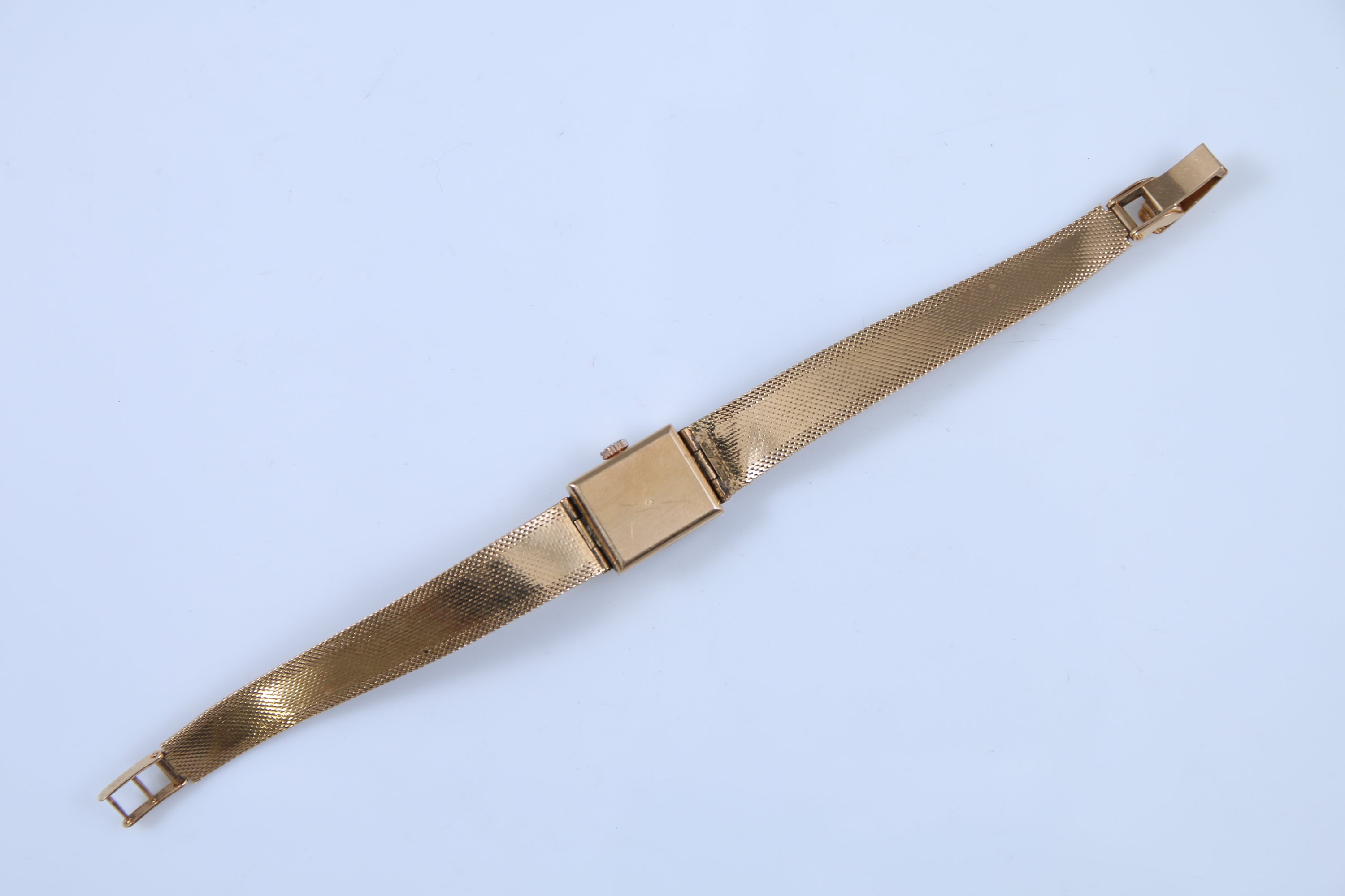 Le boitier rectangulaire au cadran champagne indique les heures par des bâtonnets.