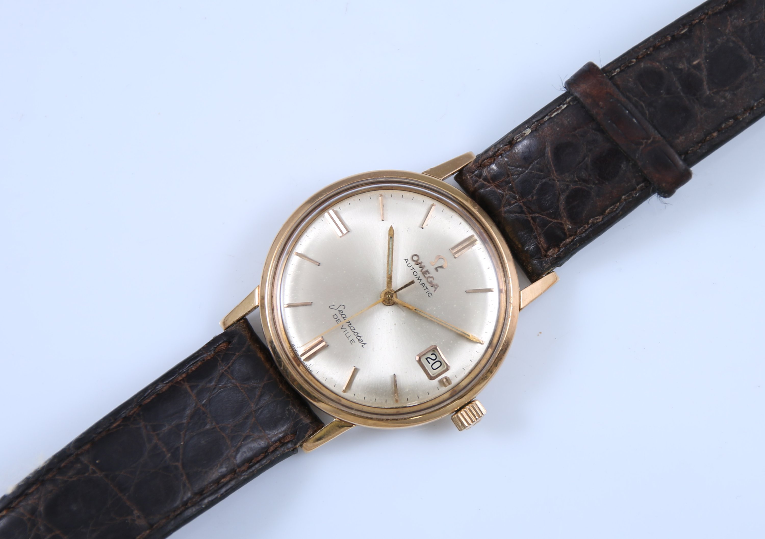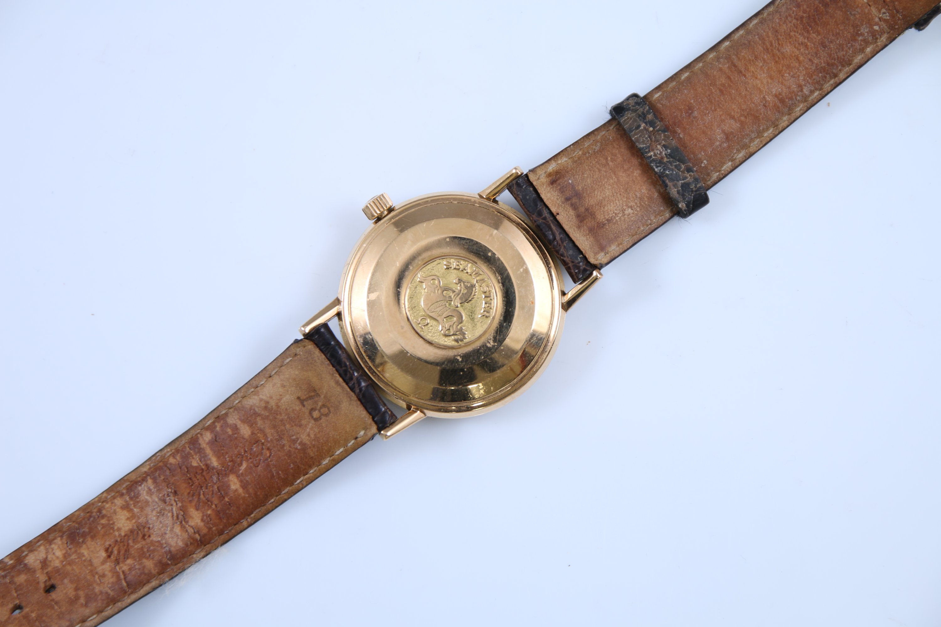 Le boitier rond au cadran satiné indiquant les heures par des index bâtonnets, trotteuse centrale, guichet dateur à trois heures. Le revers marqué "Seamaster" au décor d'un cheval marin.
