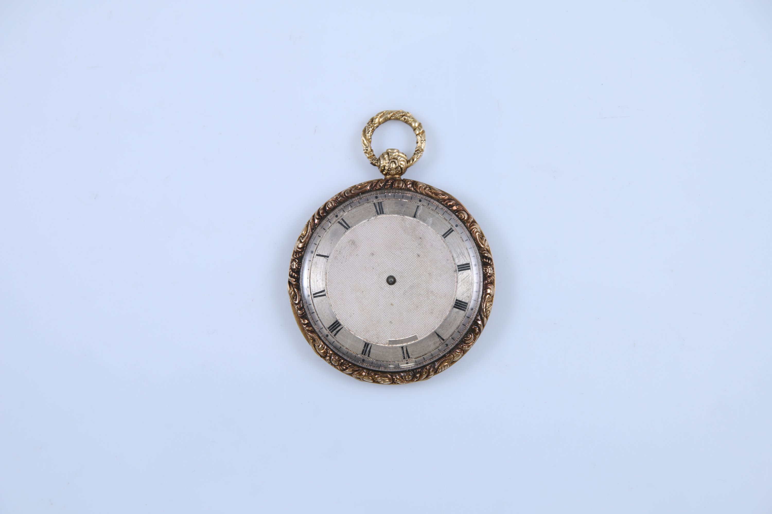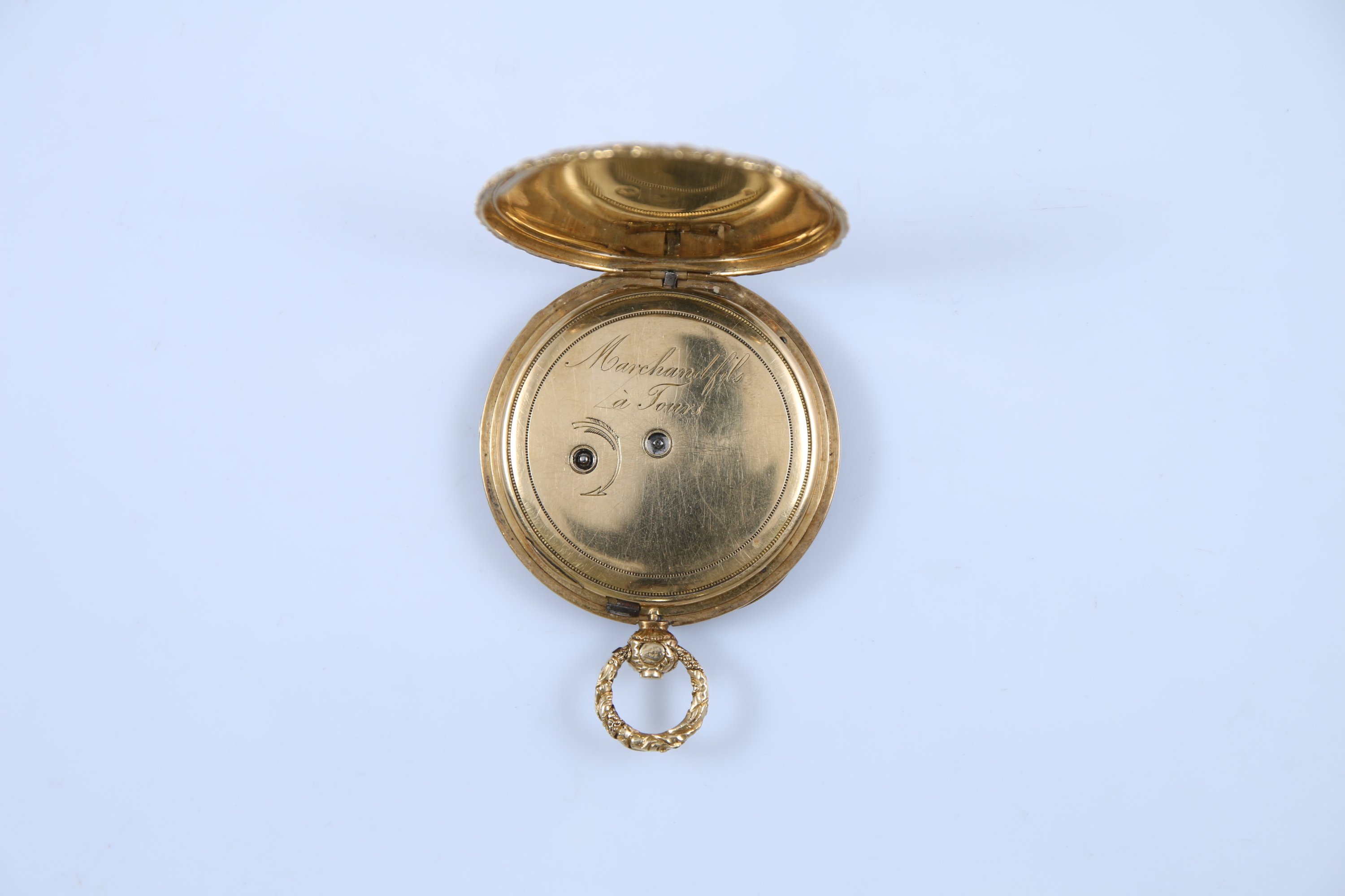 Le cadran argenté à fond guilloché indiquant les heures par des chiffres romains, les minutes par un chemin de fer. Le boitier à décor de rinceaux. Le revers guilloché. Le cache-poussière intérieur en or jaune 750 millièmes gravé "Marchand fils / à Tours" et numérotée "2049I". Remontage au revers.