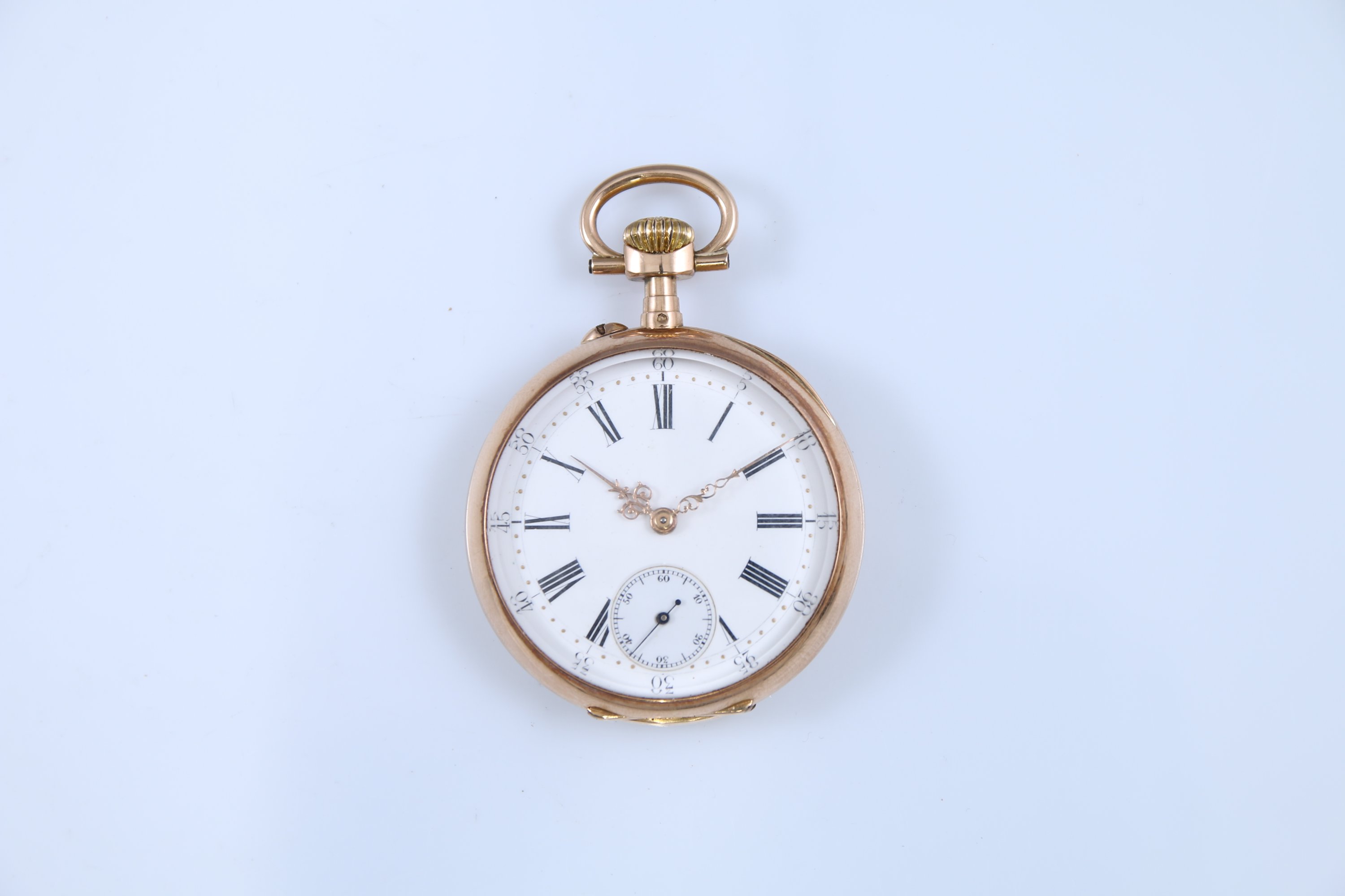 Le cadran émaillé blanc indiquant les heures en chiffres arabes et les minutes par un chemin de fer. Petite trotteuse à six heures. Monogrammée "GD" au revers. Remontoir à 12 heures. Numérotée "5758".