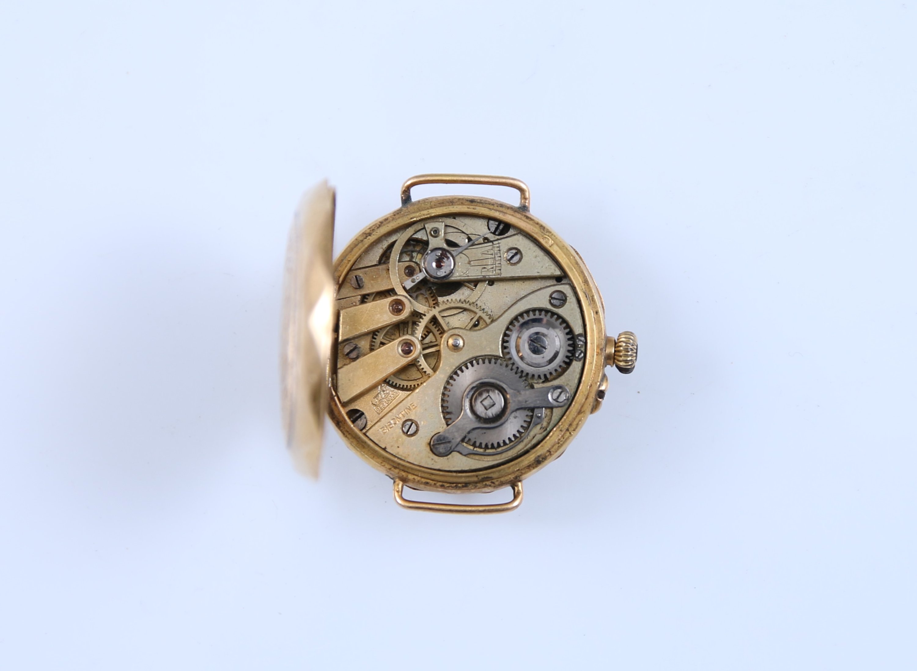 Le cadran émaillé blanc indiquant les heures en chiffres romains, et les minutes par des pointillets. Remontoir à trois heures. Cache-poussière en or jaune 750 millièmes. Le boitier gravé de fleurs.