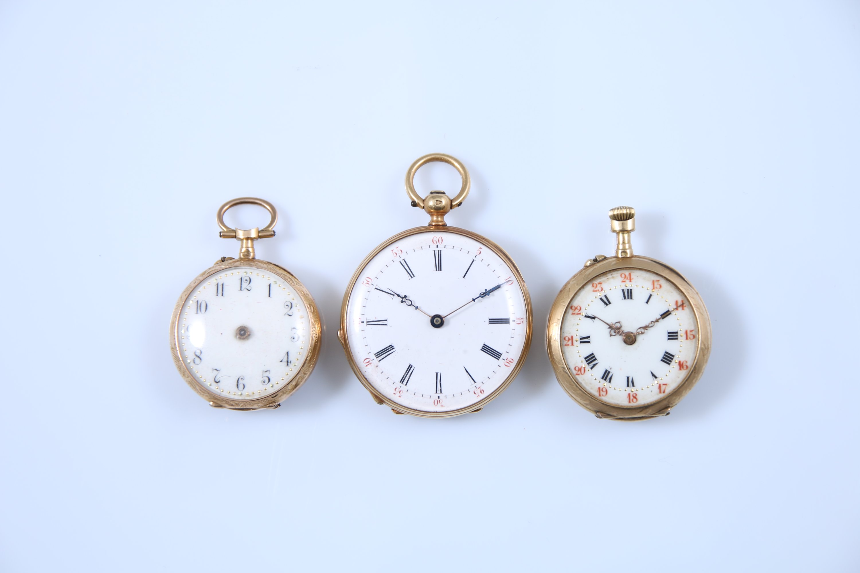 Chacune à cadrans émaillés blanc, dont deux indiquant les heures en chiffres romains et l'une en chiffres arabes. Les revers gravés et guillochés.