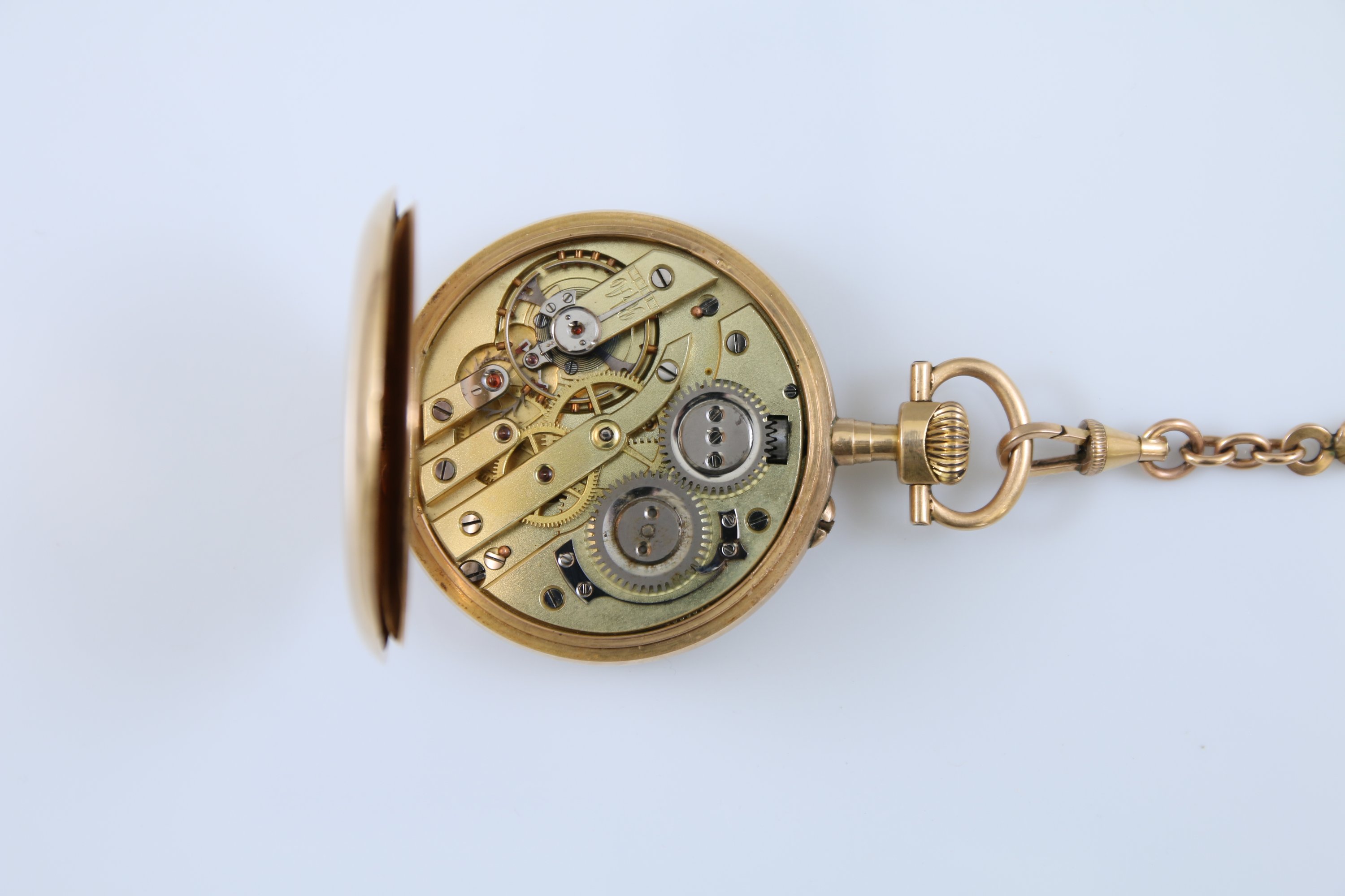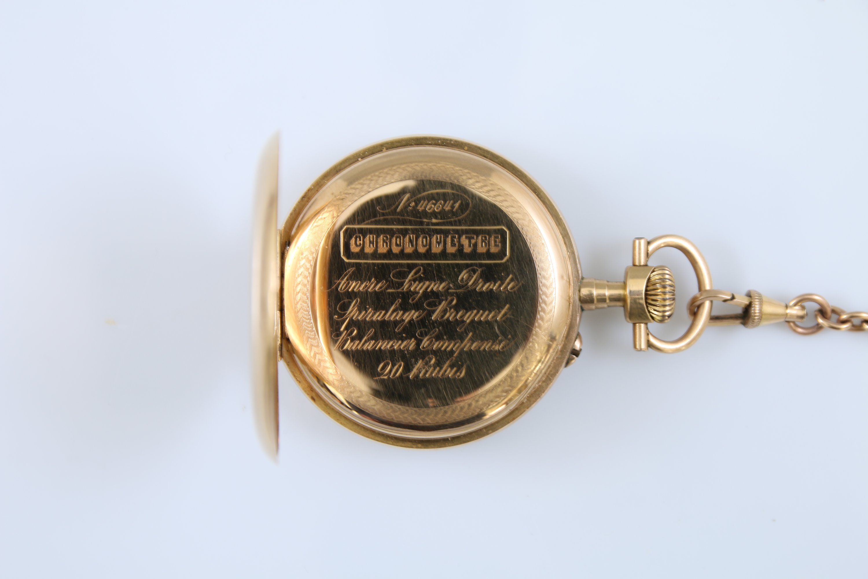 Cache-poussière en or n°46641 gravé : "Chronomètre Ancre Ligne Droite Spiralage Breguet Balancier Compensé 20 Rubis."