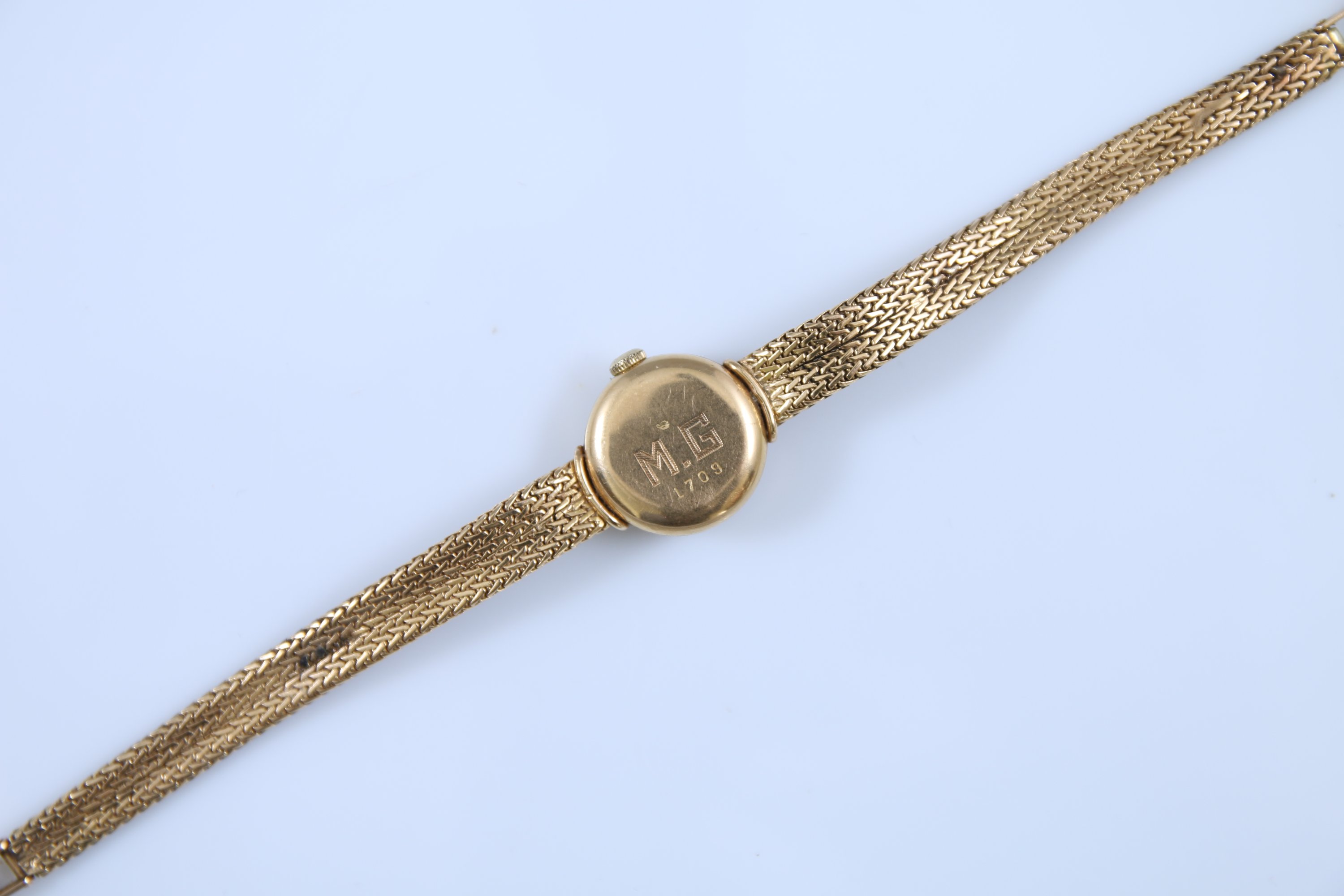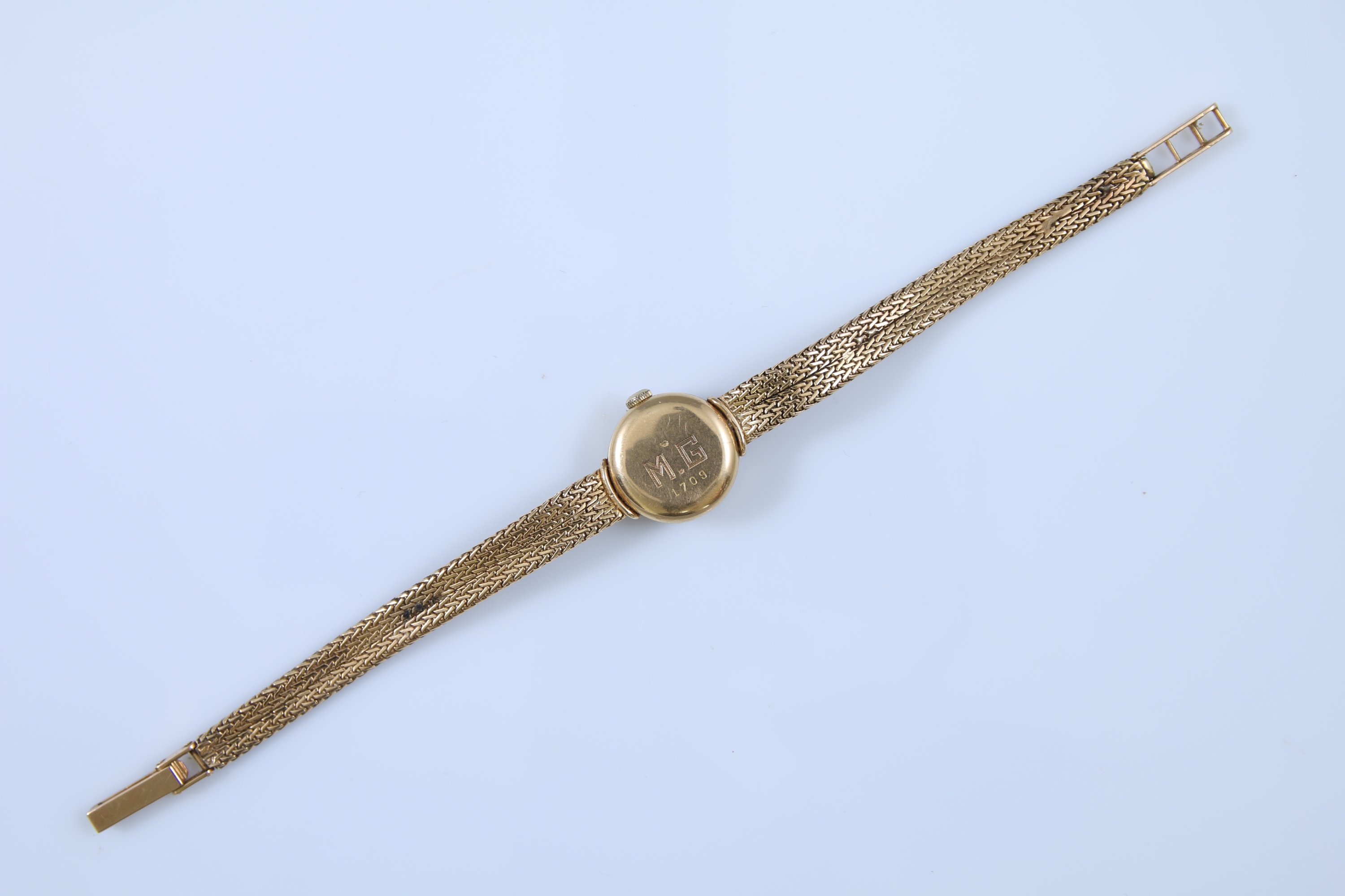 Cadran crème indiquant les heures par des index bâtonnets et chiffres arabes. Revers monogrammé "MG" et numéroté 1709.