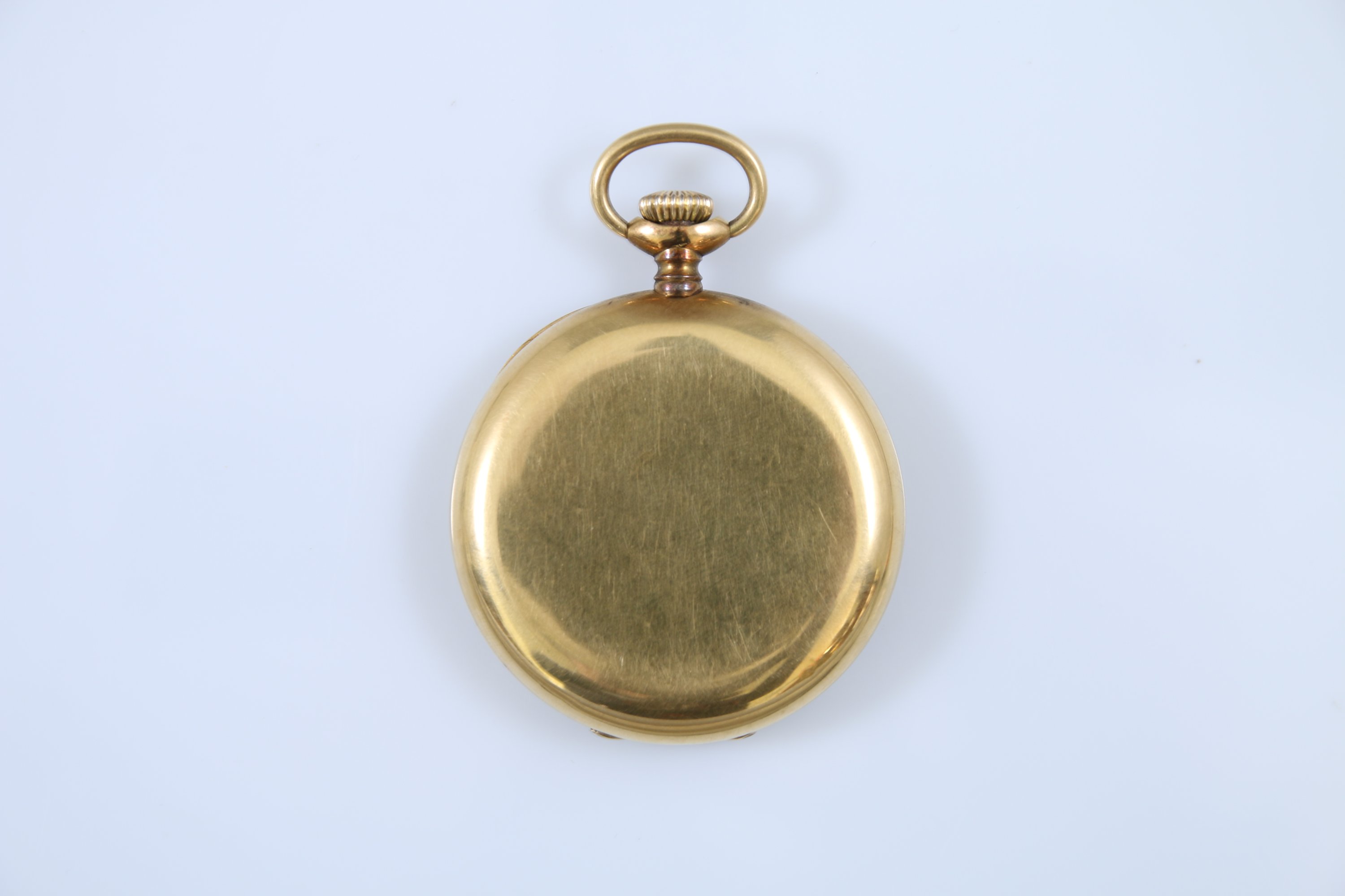 Le boitier en or jaune 750 millièmes. Double cadran émaillé avec des chiffres arabes. Remontoir à midi.