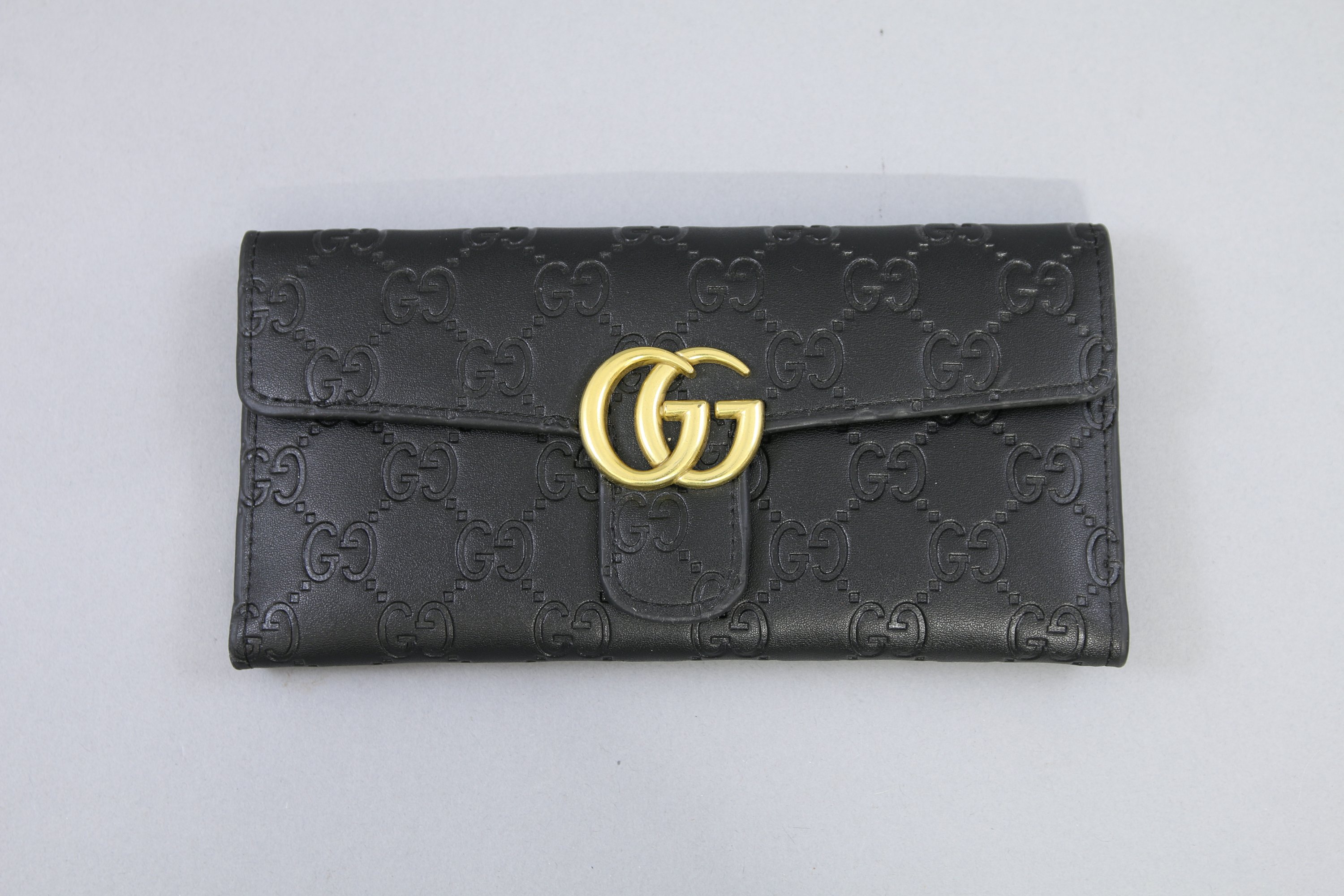 Cuir noir estampée au monogramme de la marque. Fermoir en métal doré.