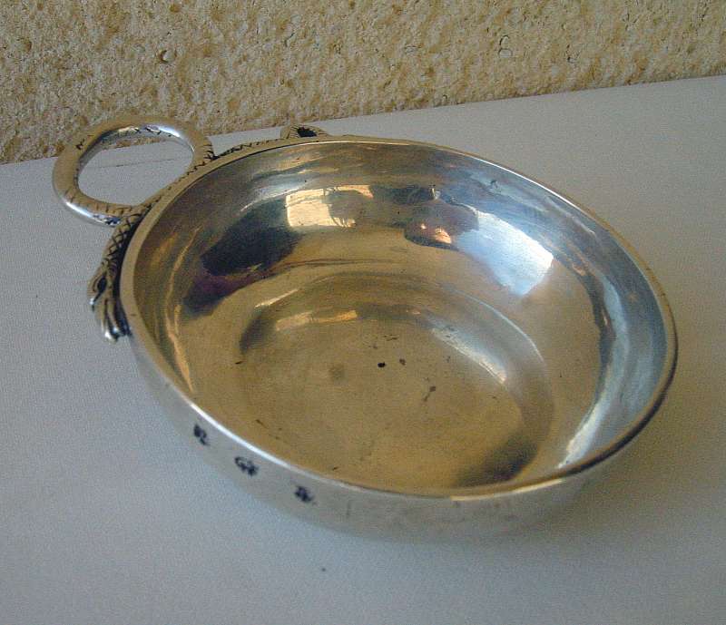 TASSE à VIN en argent à décor motifs géométriques, l'anse serpents affrontés. Poinçons amatis. Poids : 79 g.