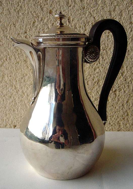 VERSEUSE en argent, section circulaire présentant un fond plat. L'encolure se relève à l'avant pour former le bec couvert, lequel est agrémenté à sa partie inférieure de canaux. Le couvercle, monté à charnière, est bordé d'une bande de feuilles d'eau ; bouton central en forme de toupie. L'anse, en bois noirci, est maintenu par une hotte à décor de fleurs. Poinçon Vieillard (1819-1838). Haut. 20 cm. Poids 465 g.