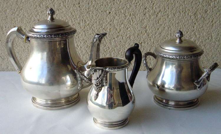 Service THÉ-CAFÉ en argent, 3 pièces : cafetière, pot à lait et sucrier à décor de guirlandes de laurier, feuillage, godrons, pomme de pin, boutons à feuilles et à graines. Poinçon Minerve. Poids total 1530 g.