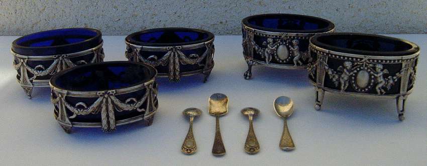5 SALIÈRES en argent repercé et repoussé. Monture ovale à décor au répertoire iconographique Louis XVI. Variantes au piètement. Saleron en verrine bleue. Poinçon Minerve. Long. 8 cm. Poids total 200 g. (sans verrine)