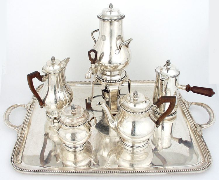SERVICE 6 PIÈCES en argent comprenant : une cafetière, une théière, une chocolatière et un sucrier avec couvercle. Poinçon Minerve. Poids brut : 2525 g. Samovard et sa lampe, avec grand plateau rectangulaire à deux anses en métal argenté ; décor de perles.