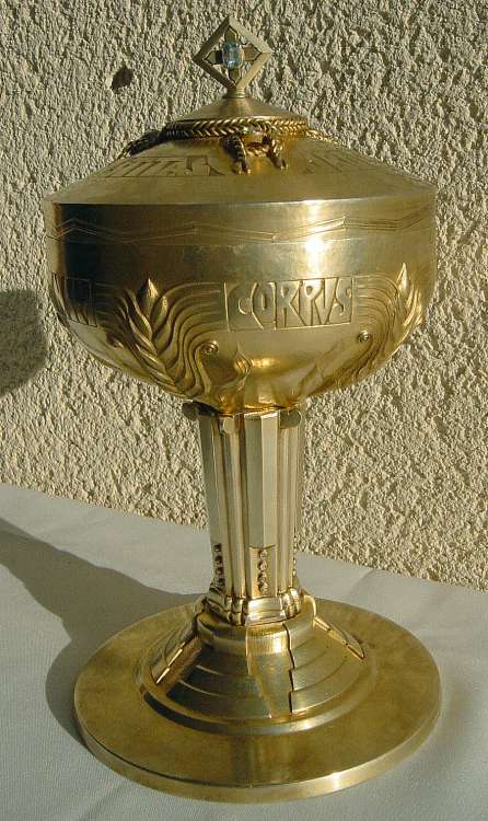 CIBOIRE en vermeil à décor de passementerie, épis de blé et motifs géométriques ; incrustation de diamants. Inscriptions latines. Style Art Déco. Signé "L. Jourdain". Poinçon "J. CHAUMET". Poids 1000 g. Haut. 25 cm. Coffret J. CHAUMET, place Vendôme.