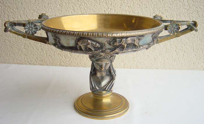 CAHIEUX Henry. COUPE circulaire en bronze doré et argenté à décor d'animaux : loup, mouton, canard et brebis. Anses en forme de branchages stylisés et ornées de fleurs et palmettes. Piédouche surmonté d'une tête de femme à l'Antique. Signé dans le décor. Inscriptions "F. BARBEDIENNE fondeur". Haut. 20,5 cm.