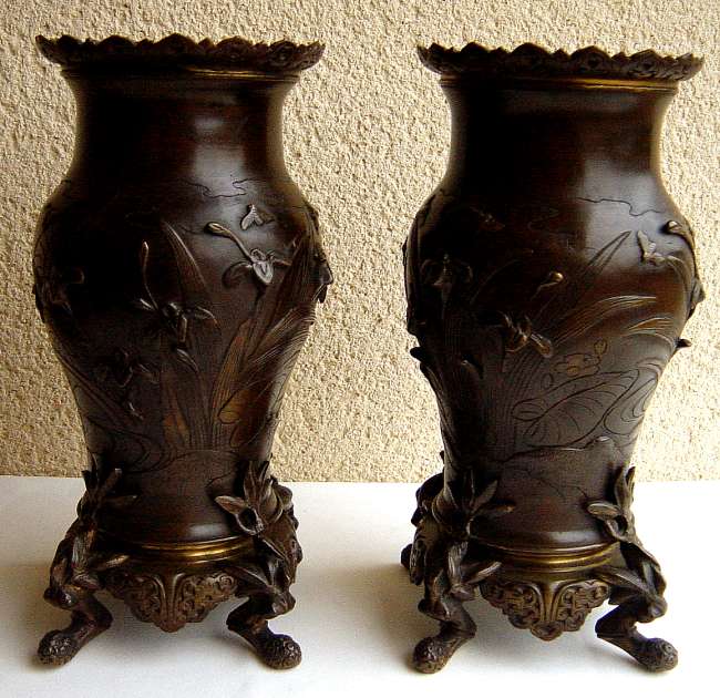 Paire de VASES en bronze à patine brune à décor d'iris et insectes en relief. Monture en bronze. Haut. 31 cm.