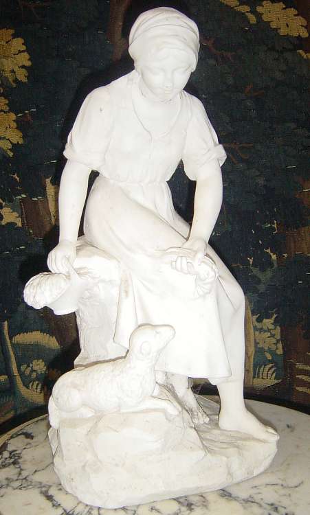 GROUPE en marbre blanc représentant une bergère et son agneau. Signature illisible. Haut. 56 cm. (accdts et rest.)