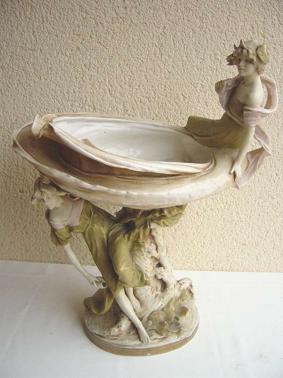 ROYAL DUX. GROUPE en céramique polychrome servant de jardinière en forme de coquillage et à décor de nymphes, tronc d'arbre et feuillage. Marqué et numéroté. Haut. 53, Larg. 43 cm. (accdts et rest.)