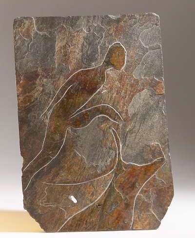 Jean ROYÈRE (1902-1981). ARDOISE représentant un homme bondissant par-dessus un buffle. Signé en bas à gauche. 28,5 x 20 cm.