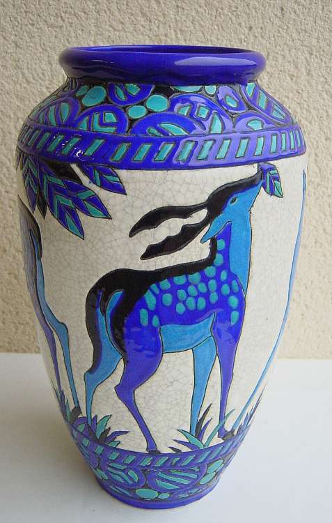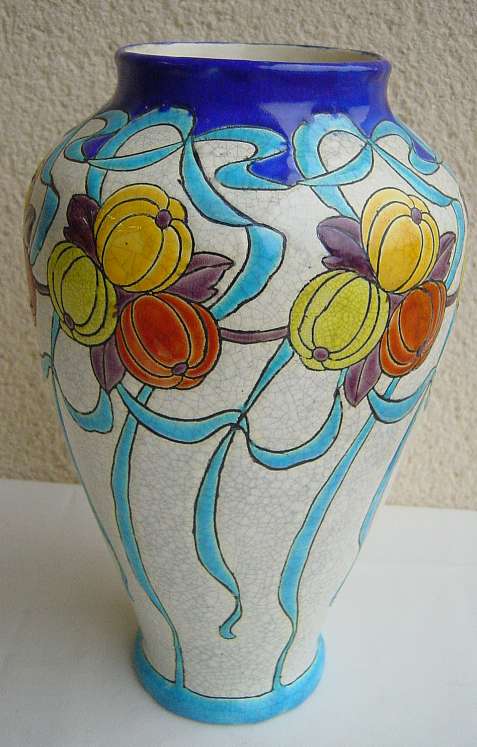 BELGIQUE. LA LOUVIÈRE. 2 VASES. L'un à décor de fruits polychromes et rubans bleus sur fond craquelé. Décor 745. Initiales "CT" pour Charles CATTEAU ; l'autre à décor de cervidés bleu-turquoise sur fond craquelé. Forme 914. Décor 943. Cachet "Made in Belgium, BOCH Fes LA LOUVIERE". Haut. 30,5 et 34 cm.