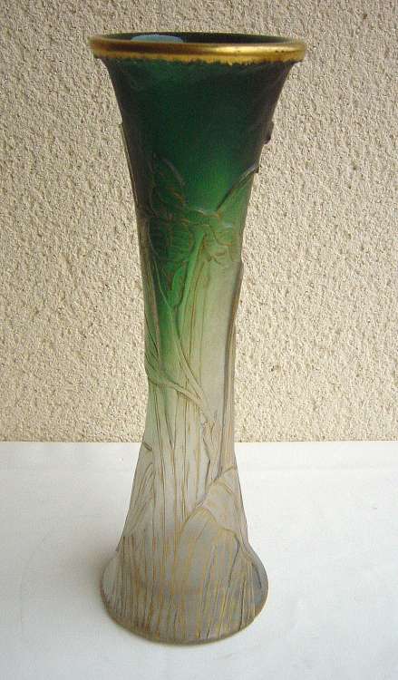 DAUM. VASE diabolo en verre blanc et émeraude à décor d'iris et libellule rehaussé d'or, sur fond givré. Signature dorée sous le vase. Haut. 35 cm. (petits éclats)