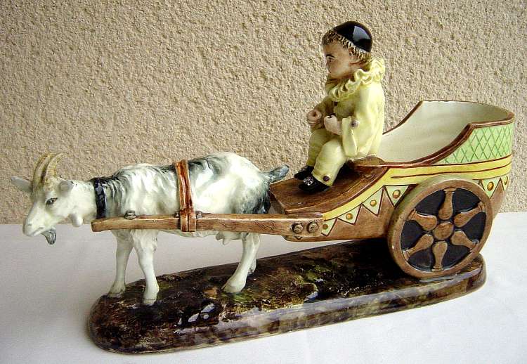 DELPHIN MASSIER. Attelage tiré par une chèvre, conduit par Pierrot. Faience. Signée.