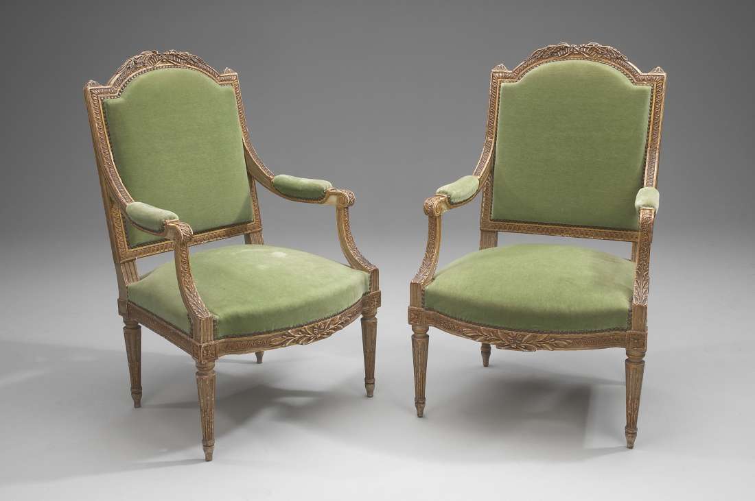Paire de FAUTEUILS à la Reine en bois laqué et anciennement doré. Dossier en chapeau de gendarme. Riche ornementation sculptée à décor de noeuds, d'entrelacs, de palmes et rosaces. Piètement avant et arrière à cannelures rudentées. Style Louis XVI, fin XIXème siècle. Haut. 102, Larg. 64, Prof. 58 cm.