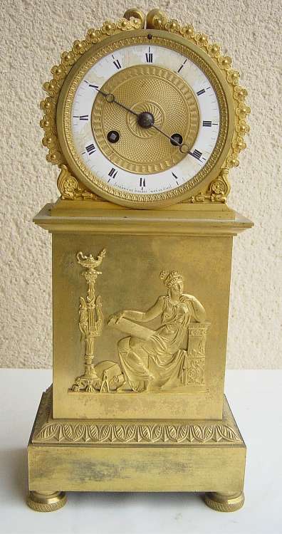 PENDULE BORNE en bronze ciselé et doré ornée de palmettes, fleurettes et feuilles d'eau. Scène en façade représentant Uronie avec ses attributs, muse de l'astronomie et de la géographie. Cadran en émail et bronze doré signé SIRONVAL, Palais-Royal n°142.