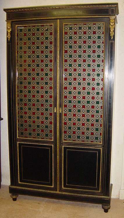 BIBLIOTHÈQUE en bois noir et filets de cuivre, ouvrant à deux portes vitrées. Ornementation en bronze doré au répertoire iconographique Louis XVI : rais de coeur, oves, triglyphes, laurier. Pieds toupies. Napoléon III, fin XIXème. Haut. 220, Larg. 119, Prof. 38 cm.