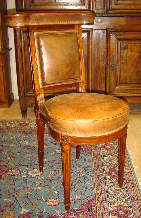 "VOYELLE" ou VOYEUSE assise en acajou. Accoudoir, dossier et siège garnis recouverts de cuir. Piètement cannelé et rudenté. Style Louis XVI, XIXème. Haut. 94, Larg. 55, Prof. 54 cm.