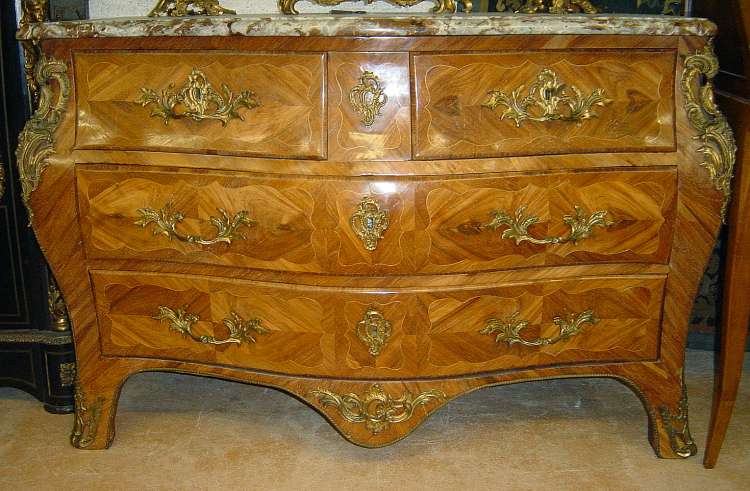COMMODE tombeau en bois de placage à jeu de frisage. Elle ouvre à trois rangs de tiroirs dont deux dans la partie supérieure. Riche ornementation (postérieure) en bronze doré et ciselé en forme d'acanthes, rocailles et agrafes : entrées de serrure, poignées, chutes, sabots et culot. Dessus de marbre rouge brèche. Louis XV, XVIIIème. Haut. 89, Larg. 130, Prof. 57 cm.