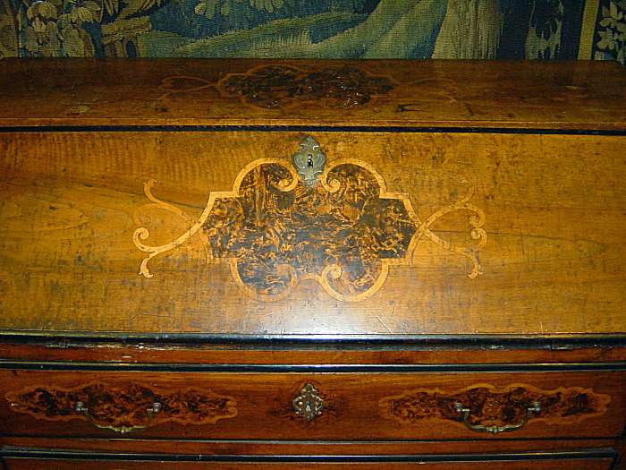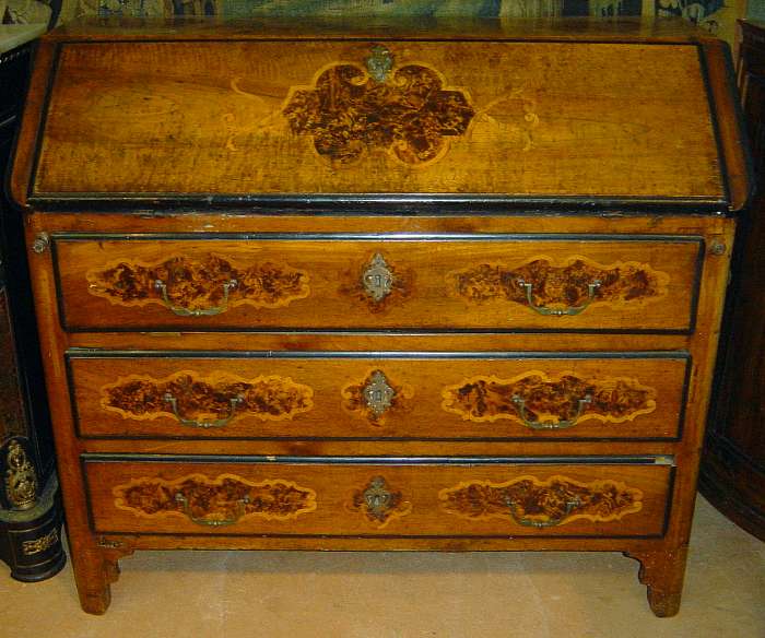 COMMODE-SCRIBAN en noyer et en bois de placage inscrit dans des réserves en loupe et filets de bois clair. Encadrements en bois noirci surlignant les bords. Elle ouvre par un abattant découvrant 6 tiroirs et casier - et par 3 rangs de tiroirs. Fin XVIIIème-début XIXème, dans le goût de Hache ou du travail italien. Haut. 104, Larg. 120, Prof. 50 cm. (mque)