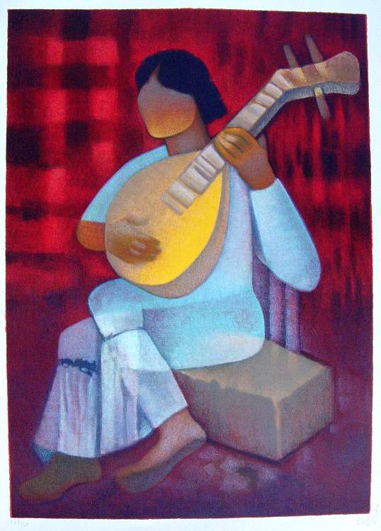 TOFFOLI Louis (né en 1907) Musicienne. Lithographie originale en couleurs. N° 139/150. Signée dans la marge. 76 x 56 cm.