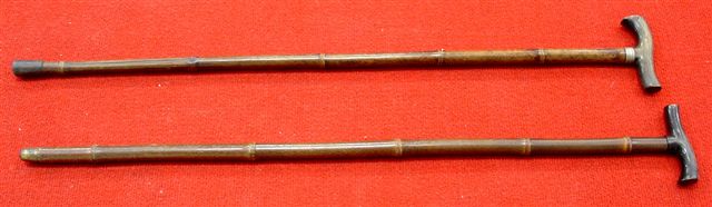 Deux CANNES de marche. Poignées en corne. Futs en bambou.