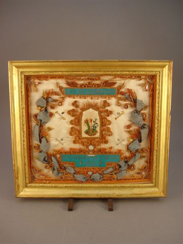CADRE RELIQUAIRE de forme rectangulaire constitué de paperoles orangés sur un tissu beige. Au centre, une vignette représente un calice surmonté de la devise IHS (Iesus Hominum Salvator). À droite, une grappe de raisin sur un ceps de vigne symbolise la Passion du Christ tandis qu'à gauche, une gerbe de blé annonce la Résurrection. De part et d'autre d'une couronne de lauriers stylisés, des reliques de saint Augustin, sainte Marie-Victoire, saint François, saint Charles et saint Étienne rappellent le sacrifice des saints pour la cause de Dieu. Dans la partie inférieure, on peut lire "SOUVENIR DU 3 MARS 1855". Dans un cadre en bois doré. Milieu XIXème siècle. 33 x 38 cm.
