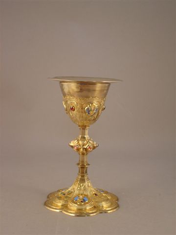 TRIOULLIER FRÈRES. CALICE et PATÈNE en vermeil. La panse du gobelet est ornée de rinceaux reposant sur des palmettes. Il s'appuie sur un fond hexagonal à bulbe orné de six cabochons d'émaux cloisonnés figurant des croix. Le fût se termine par une bague et se prolonge en une base à six lobes. Trois sont centrés de cabochons d'émaux polychromes peints figurant la Vierge, Saint Joseph et le Christ sur sa croix. Les trois autres sont ornés de rinceaux. Poinçon Minerve.