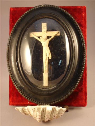 BÉNITIER. Cadre ovale de bois noirci au verre bombé contenant un haut relief de plâtre représentant le Christ sur la Croix. En dessous, un coquillage naturel fait bénitier. Fond de velours rouge.