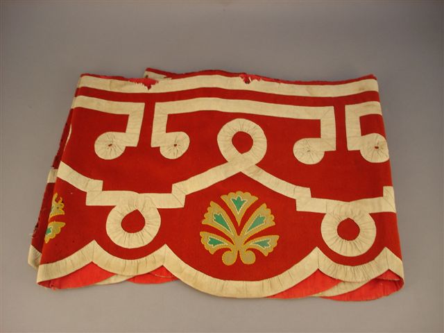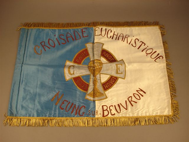 Ensemble de TROIS OBJETS LITURGIQUES comprenant un cache-ciboire en tissu brodé d'une croix et de rinceaux fleuris, une bannière religieuse de forme rectangulaire portant l'inscription "CROISADE EURCHARISTIQUE - NEUNG-SUR-BEUVRON" et au revers "CADETTES DU CHRIST - PRIE COMMUNIE SACRIFIE-TOI SOIS APÔTRE" et un parement d'autel en tissu rouge orné de motifs géométriques alternés et de fleurettes polychromes dans la partie inférieure (quelques déchirures et usures). XIXème siècle.