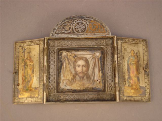 TRIPTYQUE : LA SAINTE FACE DU CHRIST. ICÔNE de forme carrée à l'imitation d'une fenêtre surmontée d'un fronton et ouvrant à deux petits vantaux. Dans la partie centrale, le visage du Christ peint sur une plaque. De part et d'autre, la partie intérieure de chacun des vantaux est ornée d'un personnage vêtu à l'antique. Poinçon de titre russe [84] et poinçon indiquant la date de 1876.