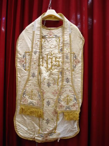 VÊTEMENT LITURGIQUE de fête en tissu brodé crème comprenant une chasuble ornée de l'inscription "IHS" et d'une étole. XIXème siècle. (déchirures).