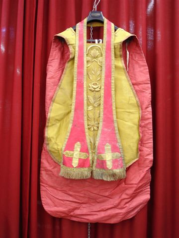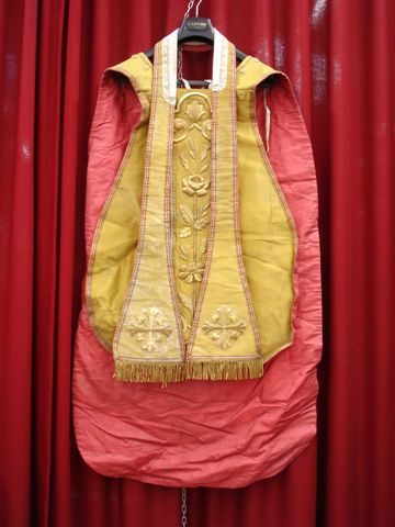VÊTEMENT LITURGIQUE du jour des Martyrs en tissu brodé rouge et or comprenant une chasuble ornée de l'inscription "IHS" et deux étoles. XIXème siècle. (quelques déchirures).