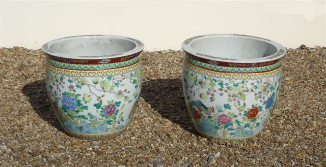 Paire de CACHE-POTS en porcelaine blanche décorée en émaux polychromes...