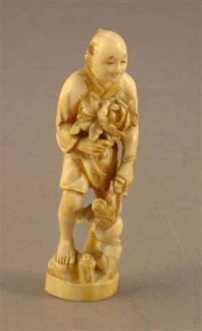 OKIMONO en ivoire du Japon. Jeune homme tenant un bouquet de fleurs dans ses mains. Haut. 8,5 cm.