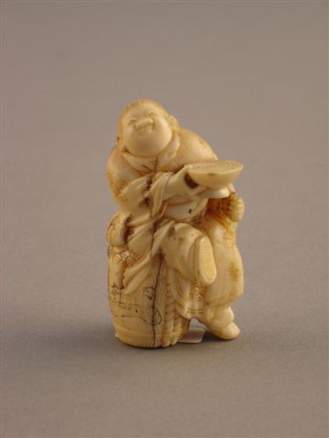 NETSUKE en ivoire du Japon. Personnage tenant une coupe à sake assis sur un tonnelet.