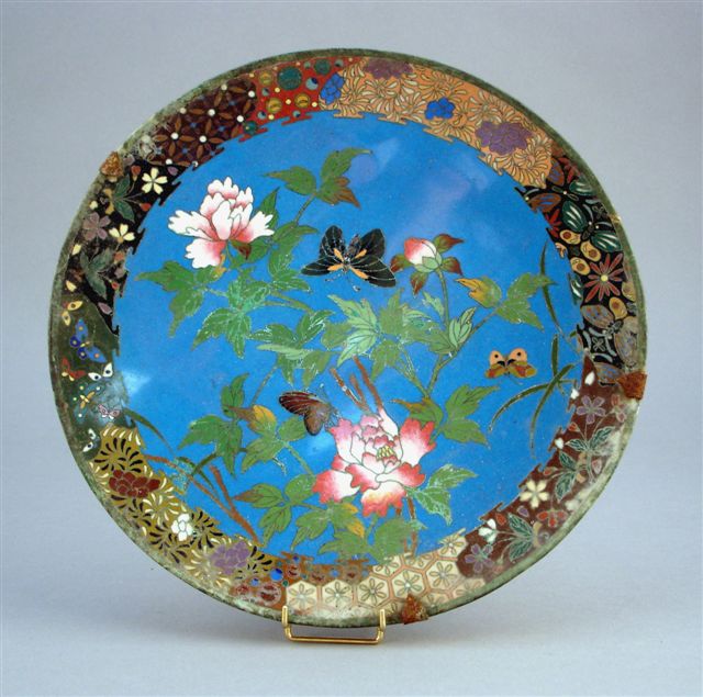 PLAT en bronze et émaux cloisonnés à décor de pivoines dans leur feuillage.