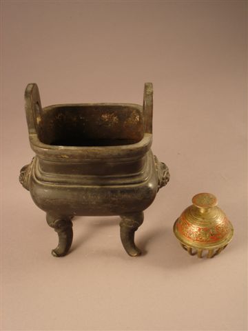 BRÛLE-PARFUM en bronze. Il repose sur quatre pieds. Prises latérales zoomorphes. On y joint une cloche en bronze ciselé à décor polychrome.