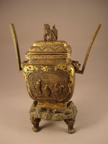 BRÛLE-ENCENS en bronze patiné et doré à décor de dragons, personnages dans des scènes champêtres. Japon. Fin XIXème siècle. Haut. 39,5 cm.
