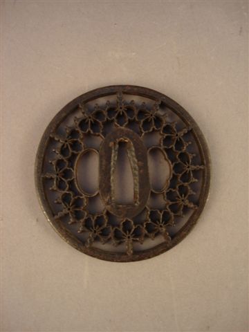 MARU-GATA en fer, décorée en kyô-sukashi de fleurs de pawlaunia. Famille Shôami.