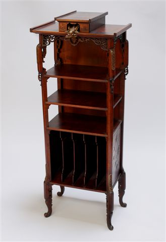 MEUBLE Á MUSIQUE de forme rectangulaire en bois naturel mouluré et sculpté. La partie supérieure, ornée d'un dragon de bronze doré reposant sur une tablette. La partie médiane comporte trois rayonnages, la partie inférieure 5 casiers verticaux. Il repose sur quatre pieds cambrés ornés de plaque de bronze ajourées de rinceaux.